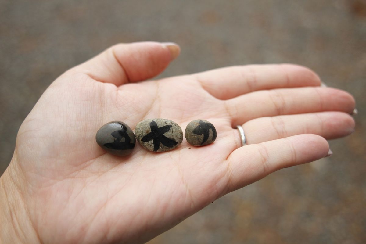 3つの文字が描かれた小石を見つけたらお守りの中に入れて持ち帰りましょう。願いが叶ったら、石を倍にして自分が拾った石と一緒に五所御前へ返すというのが慣わし。