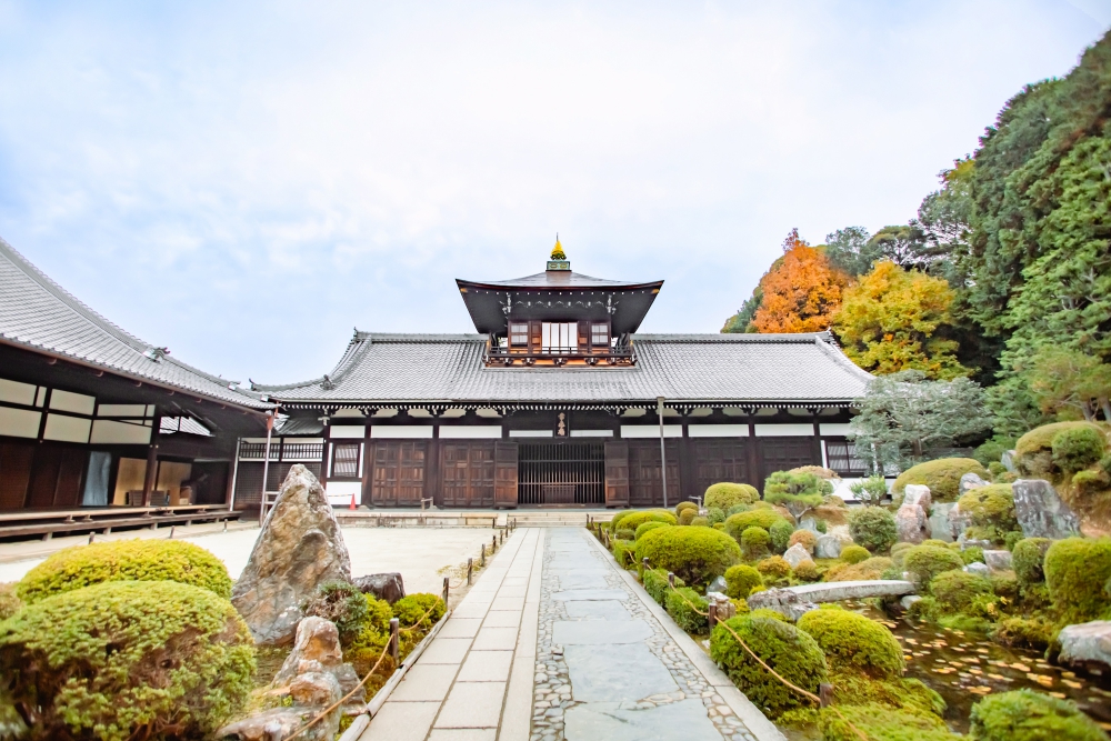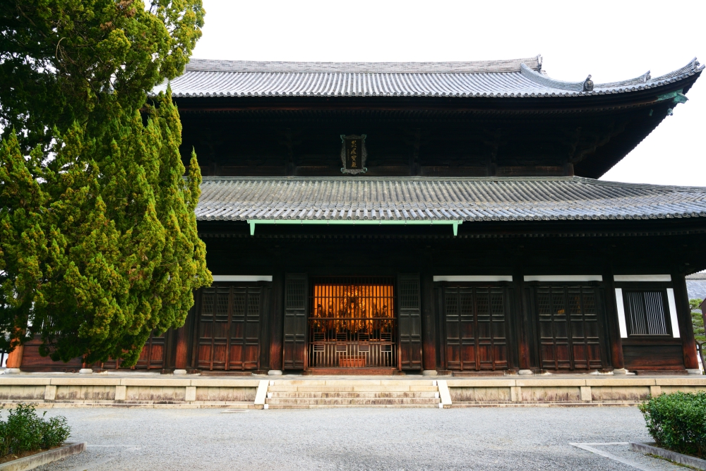 参拝客が通る日下門を抜けた先にあるのが本堂(仏殿兼法堂)です。昭和9年(1934)に建てられた重層入母屋造の大建築で、天井には大正から昭和にかけて活躍した日本画家・堂本印象が手がけた蒼龍図が描かれています。