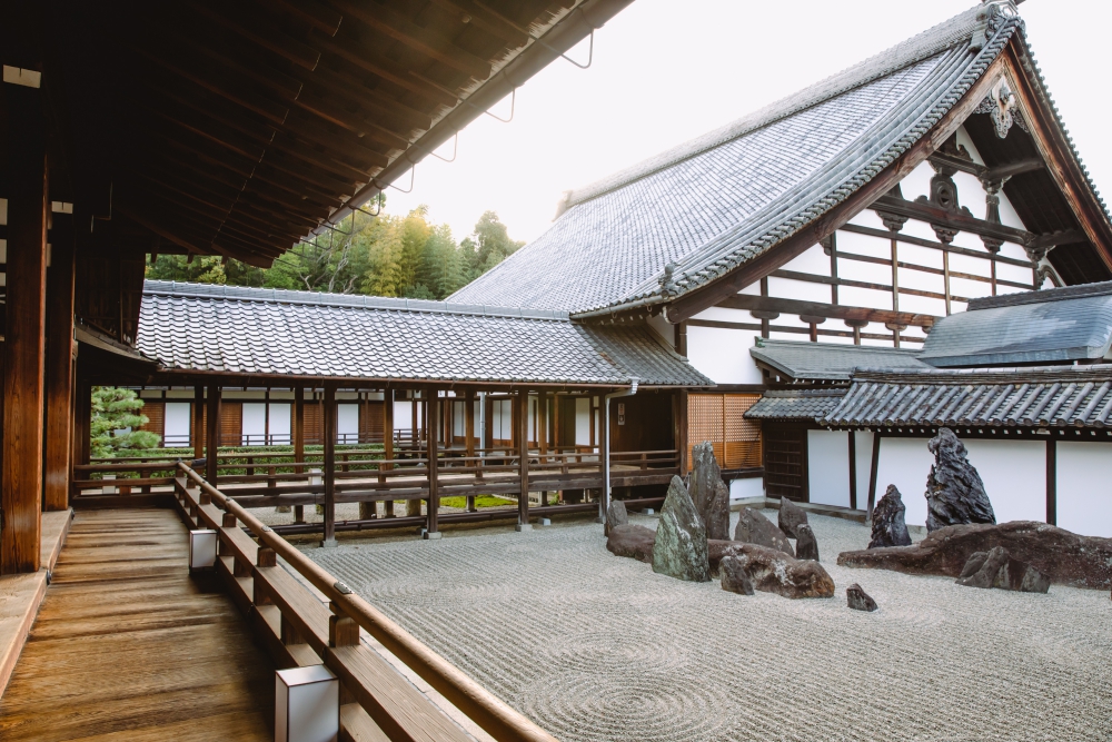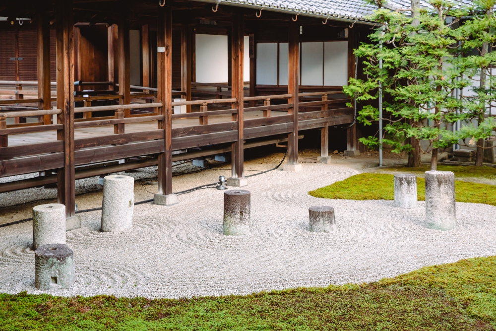 南庭は、巨大な石と白砂で神仙島と海を造り上げた枯山水庭園。砂の渦は荒れた波を見立てています。