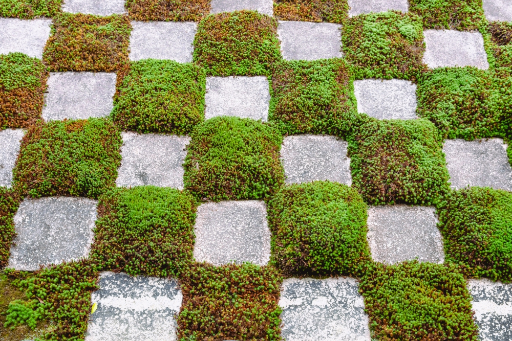 北庭は、かつて勅使門から方丈まで敷かれていた切石を再利用して苔と合わせた市松模様がモダンな印象を与えます。