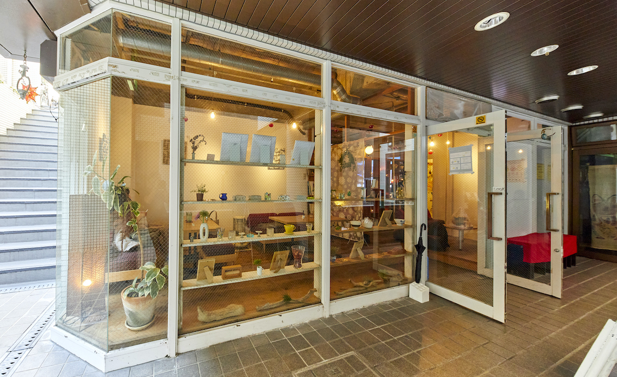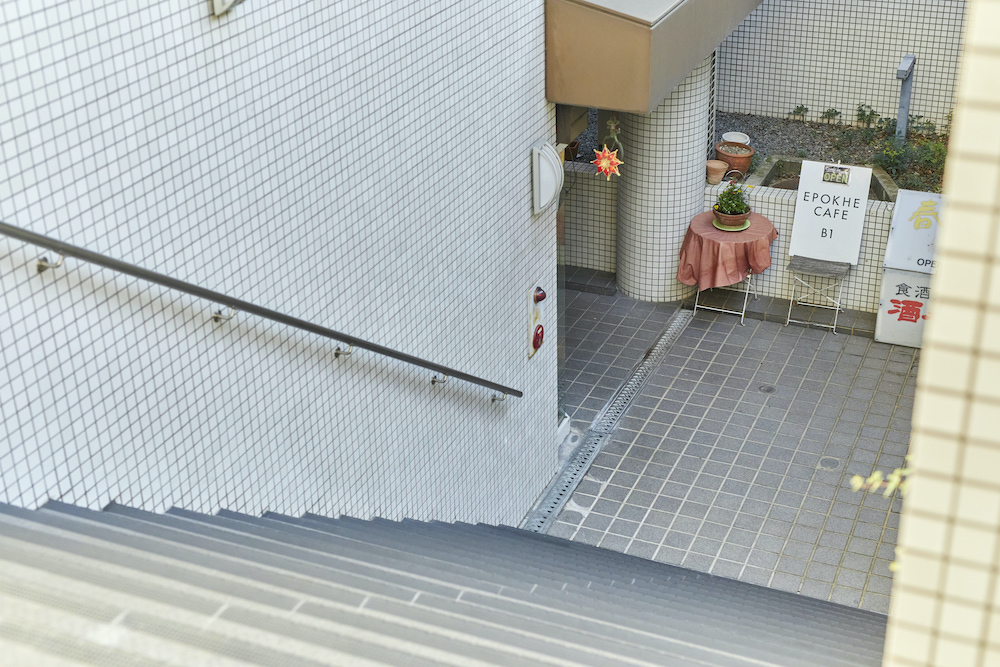 ビルの裏側の階段を降りると、外観やエントランスからは想像できない可愛らしいカフェが目の前に現れました。ガラス張りで、店内の様子が外からでもよくわかります。