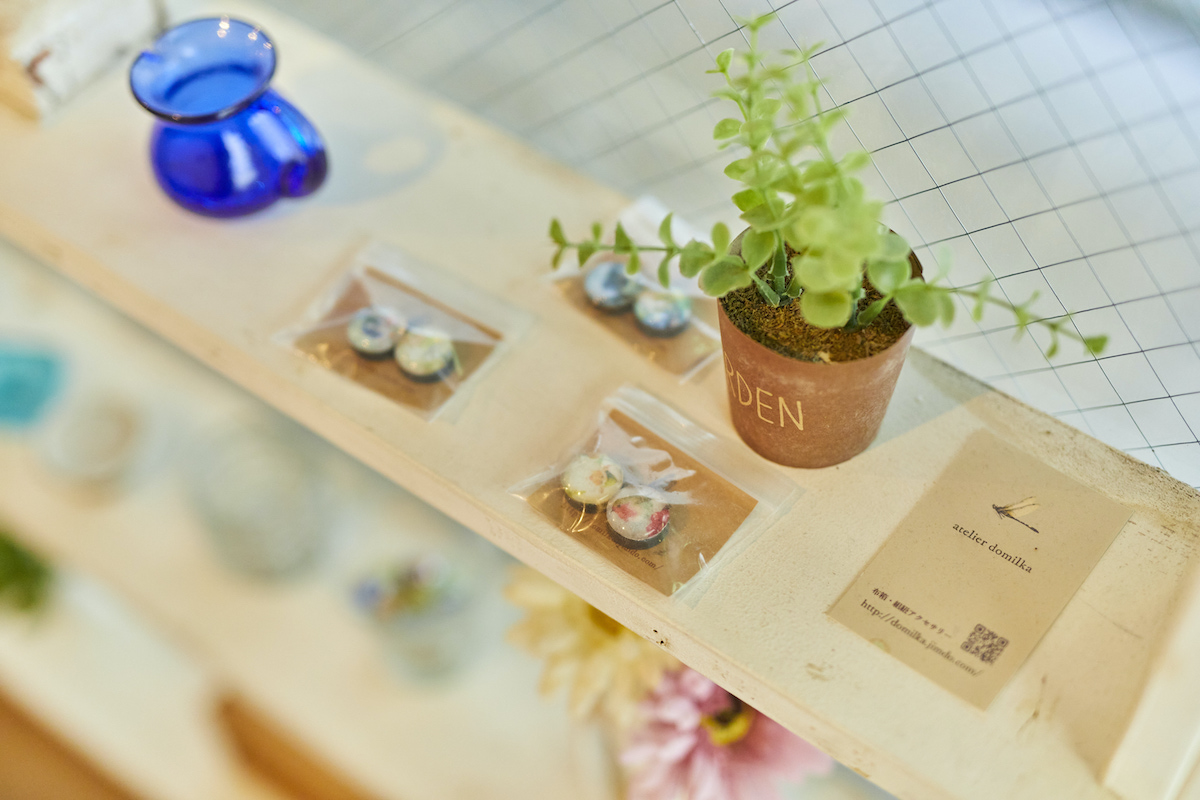 配管を剥き出しにした天井から吊るした照明、無垢材を敷き詰めた床、窓に並ぶ飾り棚などアトリエのような雰囲気のギャラリー併設席。自然光の差し込む爽やかな空間です。