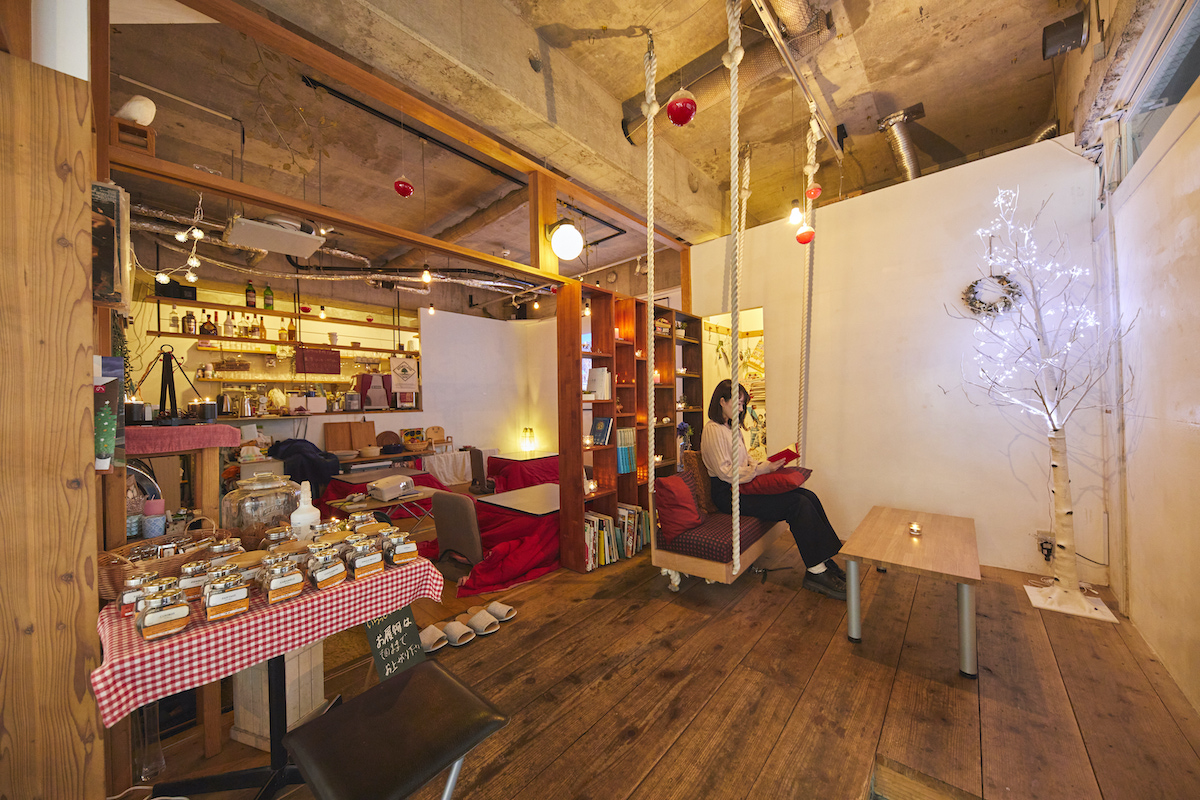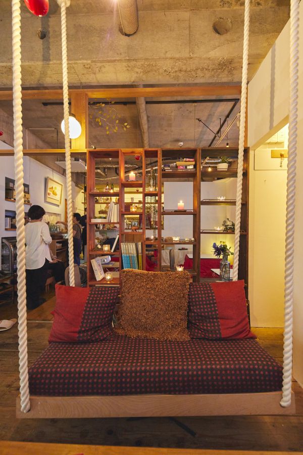 2人掛けのブランコ席は、映え写真が撮れる特等席! ちょっぴり特別感のあるカップルシートです。このブランコもギャラリー席のソファも、芸術系の大学に通っていた学生さんの卒業制作。この店に置くために設計されたそう。そんなエピソードからも、この店が学生たちにとても愛されているのがわかります。