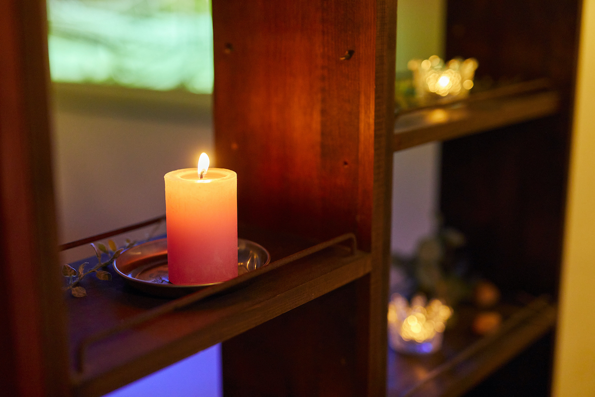パーテーションの奥は、土足禁止エリア。キャンドルが飾られ、ほのかな灯りがロマンチックな雰囲気を演出します。