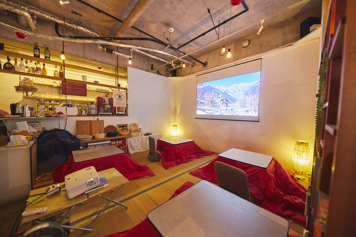奥にはなんと、こたつが4つ! 気温が低くなる11月頃、部屋の模様替えが行われ、こたつが登場します。