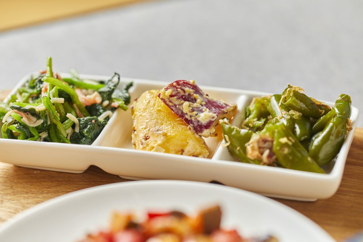 今日の定食の内容は、バターナッツかぼちゃのポタージュ、塩麹につけた豚ロースのチーズ焼ラタトゥイユ、レンコンの肉だんご、ほうれん草とカニカマのナムル、さつまいものハニーマスタード和え、ピーマンとじゃこのやわらか煮。化学調味料無添加のやさしい味が体をデトックスしてくれます。18時からの夜定食ですが、予約をすればランチタイムでも提供してくれるそう。