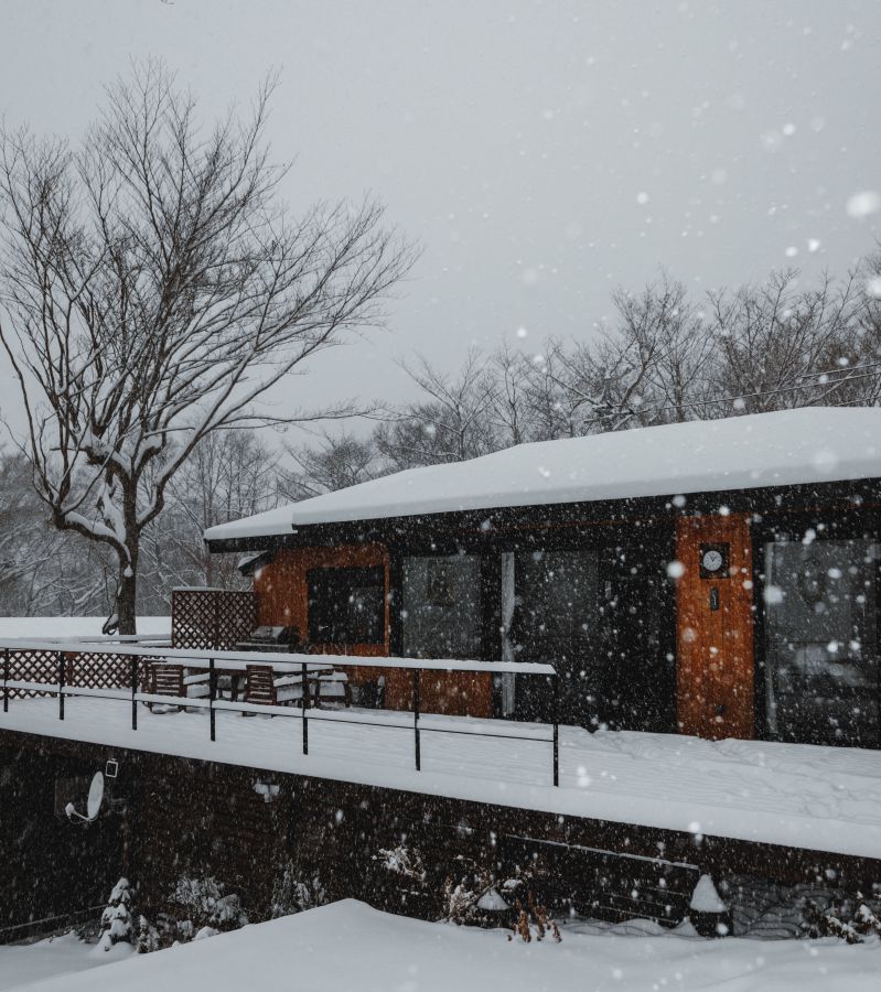 冬はあたり一面にしんしんと雪が降り積もり、真っ白な景色が! ウッド調の建物と白い雪のコントラストが、ほかの季節とは違った雰囲気でドキドキ。