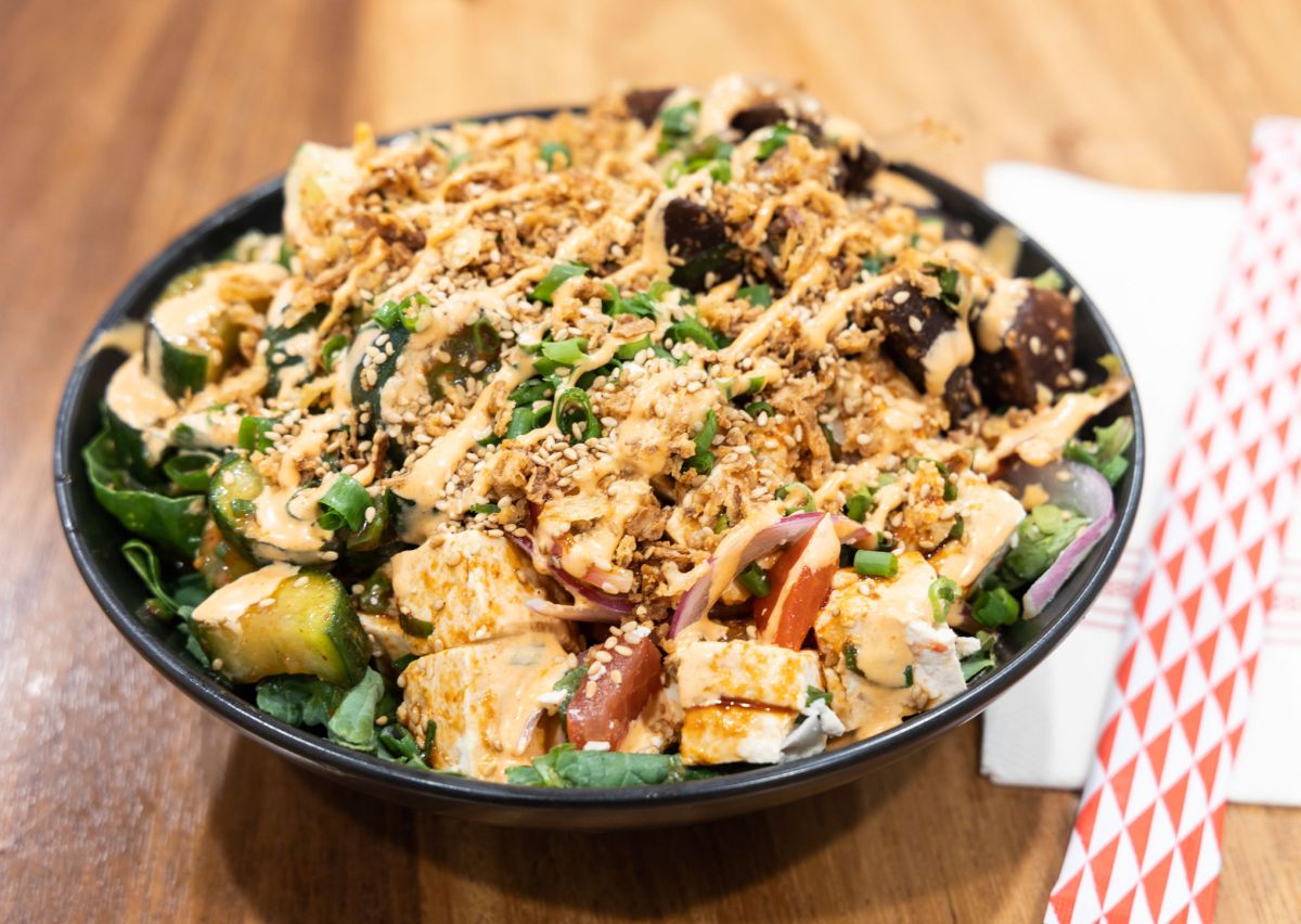 カスタマイズの他、お店のシグネチャーボウルもあります。こちらはヴィーガン対応の「ダ・レインボウル」$17。ベースはサラダで、お魚の代わりに豆腐とビーツのポケがのっています。その他アボカド、きゅうりのキムチ、ネギ、ごまがのり、スパイシーアイオリソースがかかっているので、ヴィーガン仕様でもこれ1つでお腹がいっぱいに。この他、ポケが選べる、ちらしスタイルの「ライジングサン」やコリアン風の「ソウルボウル」などがあるので、カスタマイズが面倒な場合はシグネチャーボウルで簡単にオーダーするのもおすすめです。