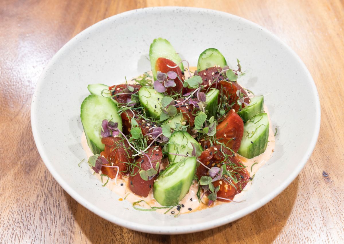 ハワイ産のカムエラトマトときゅうりにウメフレンチ・ドレッシングとマイクロしそがのった「しそトマトサラダ」$12は、甘酸っぱいウメの風味が豊かで、その見た目の美しさも◎。和のテイストが際立つひと品です。