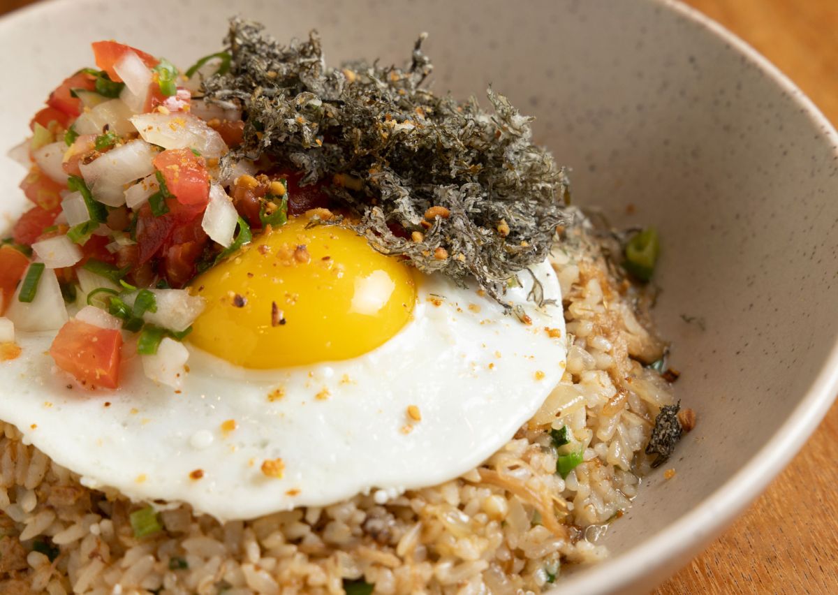 こちらは「カルアピッグ・フライドライス」$16。ハワイの名物料理「カルアピッグ」は、豚を蒸し焼きにし、細かくほぐしたもの。パラパラのフライドライスには、目玉焼きとこれまたハワイらしいロミサーモン、オゴ(海藻)を素揚げしたものがのっていて、全てをミックスして食べれば、やみつきのおいしさ!