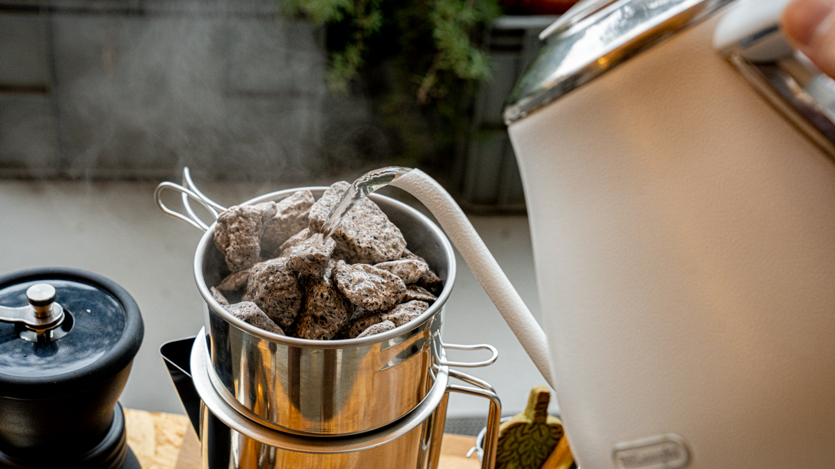 独自の抽出方法に合わせてブレンドしているコーヒー豆を、ゴリゴリとコーヒーミルで挽くところからスタート。粉になった豆をドリップする際に、スタッフさんが熱したお湯と麦飯石を持ってきてくれます。麦飯石にお湯をかければ、じゅわっと水蒸気が立ち上りつつ、そのまま豆にも熱湯が落ちる仕組みです。ロウリュサウナと同様にエンタメ感たっぷり、ワクワクが止まりません♪