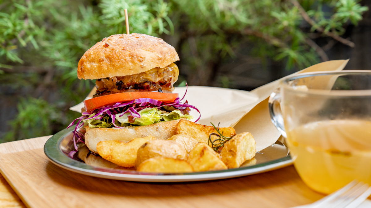 チェダーチーズ、タマネギ、トマトなど個性豊かな具材と調和しているのが、もっちりと力強い食感のバンズ。ライ麦粉入りの特製生地を石窯で焼いたものだそう。付け合わせは、ほっくほくのフライドポテト。この日の日替わりスープには、テラス席で育てているローズマリーまで入っていました!