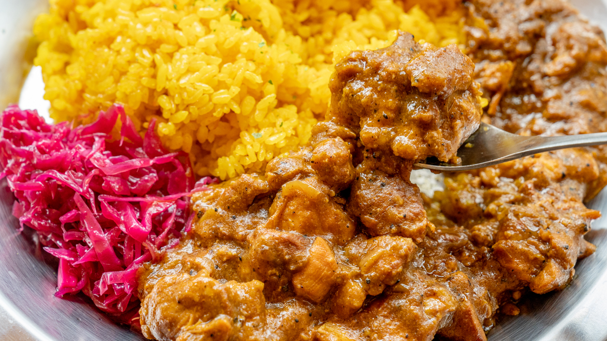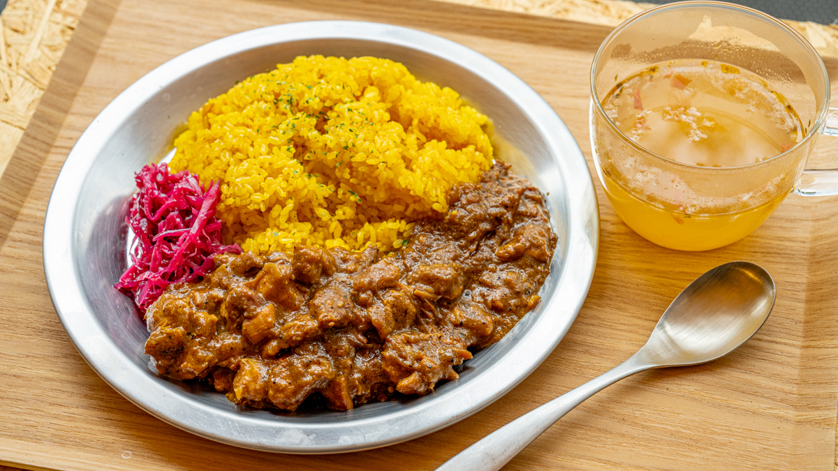 独自にブレンドした10種類以上のスパイスとともに、寸胴鍋で鶏もも肉を半日以上じっくり煮込んで作るのは「チキンカレー」850円。新鮮な果物のエキスが溶け込んでいるため、しっかりとした辛さのなかにやさしい甘さも感じます。お肉たっぷり、ターメリックバターライスも相まって満足感は抜群。リンゴ酢でさわやかに仕上げた紫キャベツのアチャールもアクセントに最適でした。