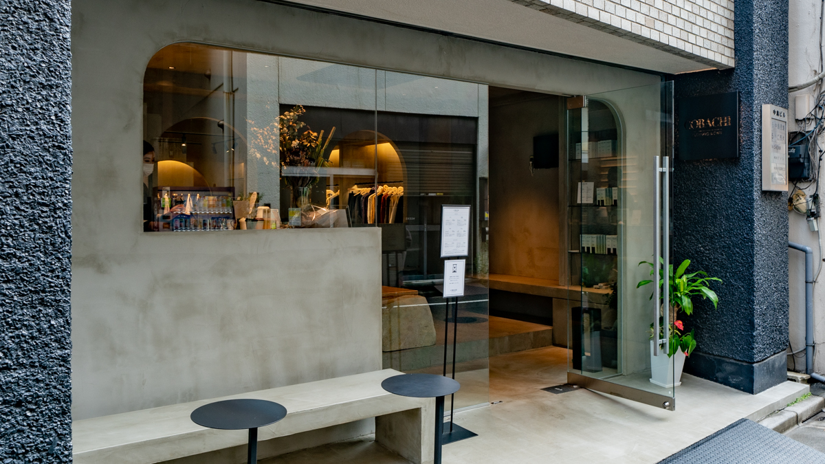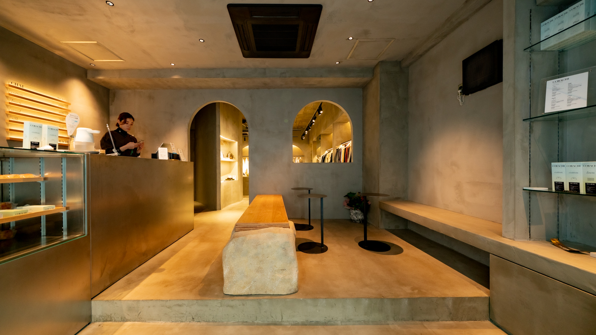 店名の由来は日本の食卓に欠かせない「小鉢」。さまざまな調和を保つために必要な存在という解釈で「人と人、人と物をつなげる橋渡し」といった意味を込めて名付けたそう。交流が生まれる場所でもあるカフェスペースは、石や金属を彷彿とさせる無機質な雰囲気。洞窟のような入口のブティックは、海外の修道院からインスパイアされたデザインです。