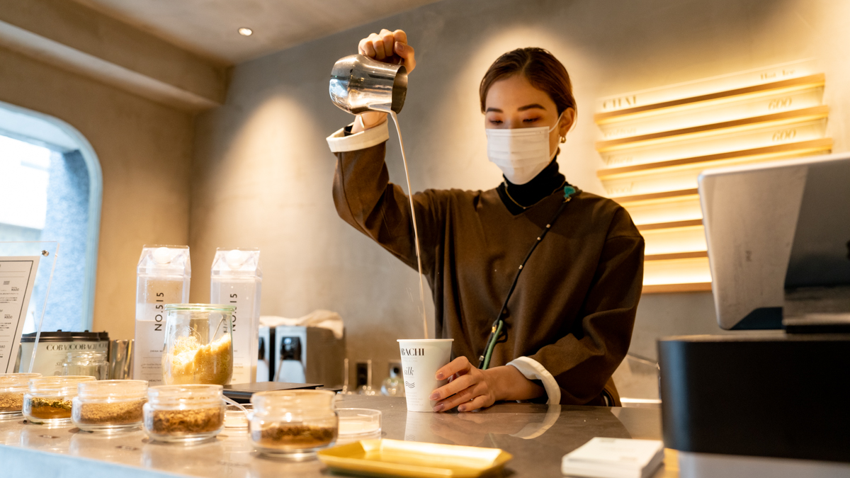 香り豊かな沖縄県産ジャスミン、高品質なフランス産ラベンダーを中心に、6種のスパイスを重ね合わせたという「シルク」。なめらかなでクリーミーな口当たりは、カップへの注ぎ方にも秘密があるよう。高い位置から勢いよくミルクを注ぎ入れることで、きめ細やかな泡を立たせていました。