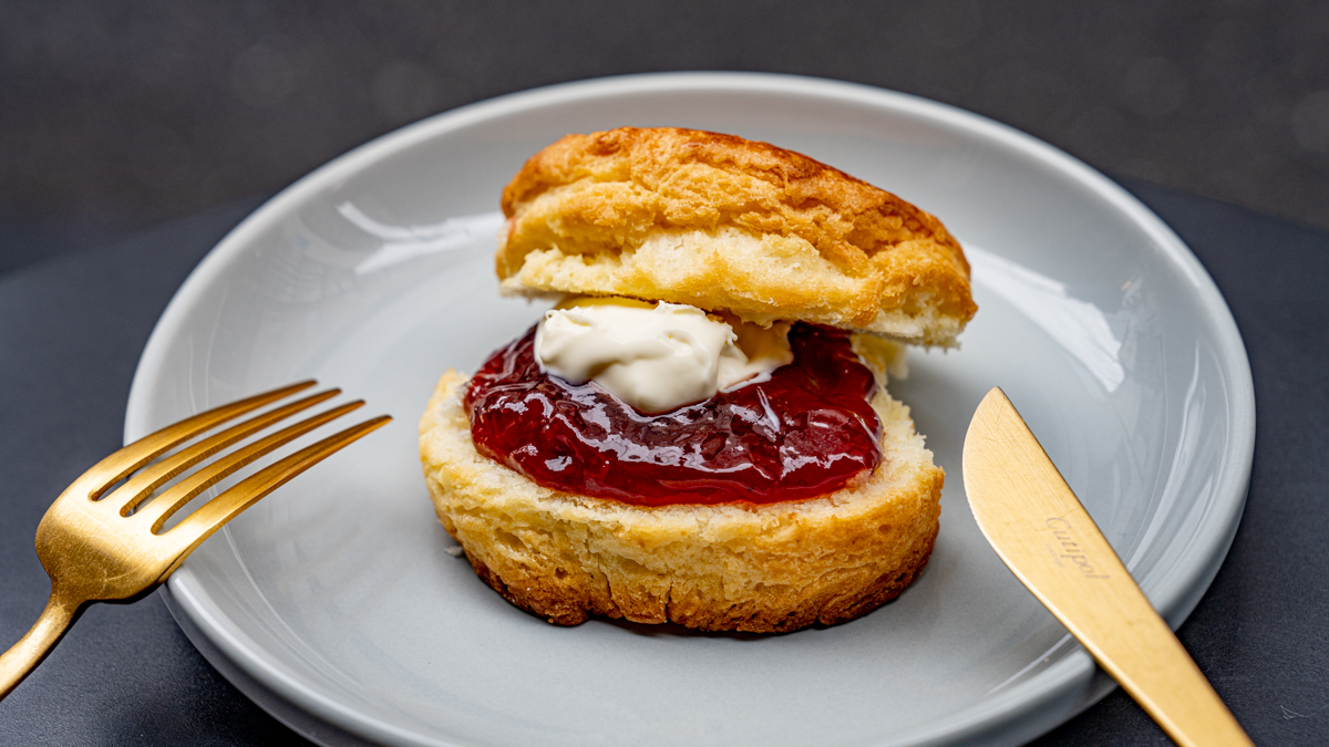 こちらは大阪の中崎町にある洋菓子店「Douceur(ドゥサール)」とのコラボレーションによる「スコーン:プレーン」380円。高級な国産小麦やビートグラニュー糖を使用しており、香り高いチャイとも相性抜群です。今回は「クロテッドクリーム&オーガニックジャム」160円と合わせて、よりぜいたくな味わいを楽しみました。