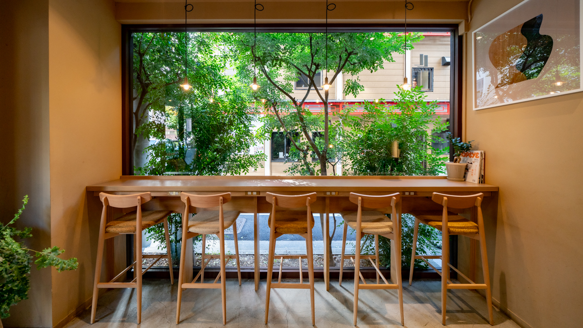 柔らかな木漏れ日が差し込むカウンター席には電源を完備。フリーWi-Fiも備えているため、ちょっとした作業など仕事の途中に立ち寄るのにも最適なロケーションです。銀座ということもあって、ここまで利便性の高い環境は近所ではなかなか見つからないでしょう。