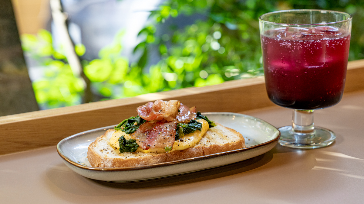 軽食の定番はドリンクがセットになった「オープンサンド」1300円。「あんこマスカルポーネ」や「ブルーベリーマスカルポーネチーズ」にも惹かれましたが、今回は「ベーコンスクランブルエッグチーズほうれん草」をオーダーしました。