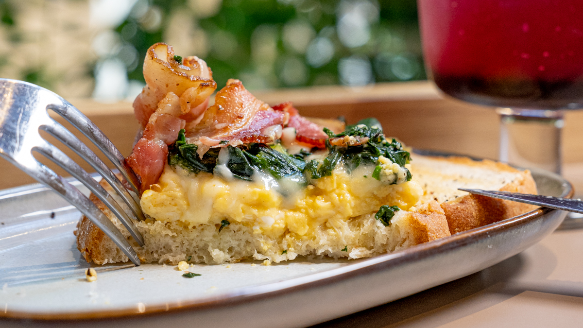 カリカリに焼かれたカンパーニュ生地の上にトロトロのチーズと卵。軟らかくて食べやすいホウレンソウ、カリッと焼かれたベーコンの対比もおもしろく、食感や味のコントラストが抜群でした。粗挽きのブラックペッパーやハーブ塩も利いていて、食べごたえもありますよ!