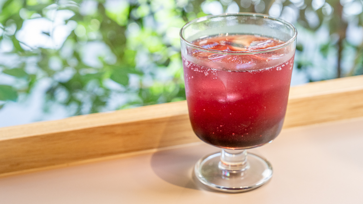 セットの飲み物に選んだのは「ブルーベリースカッシュ」。ブルーベリーコンポートのエキスを炭酸で割った自家製ドリンクで、自然な甘酸っぱさと炭酸の刺激がたまりません。