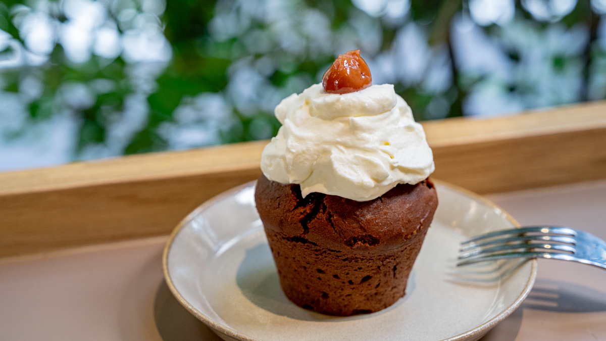 デザートには自家製の「ココアマフィン」580円をオーダー。ラム酒が香るマスカルポーネベースのクリームの上にサワーチェリーがのっている、かわいらしい見た目も魅力です。