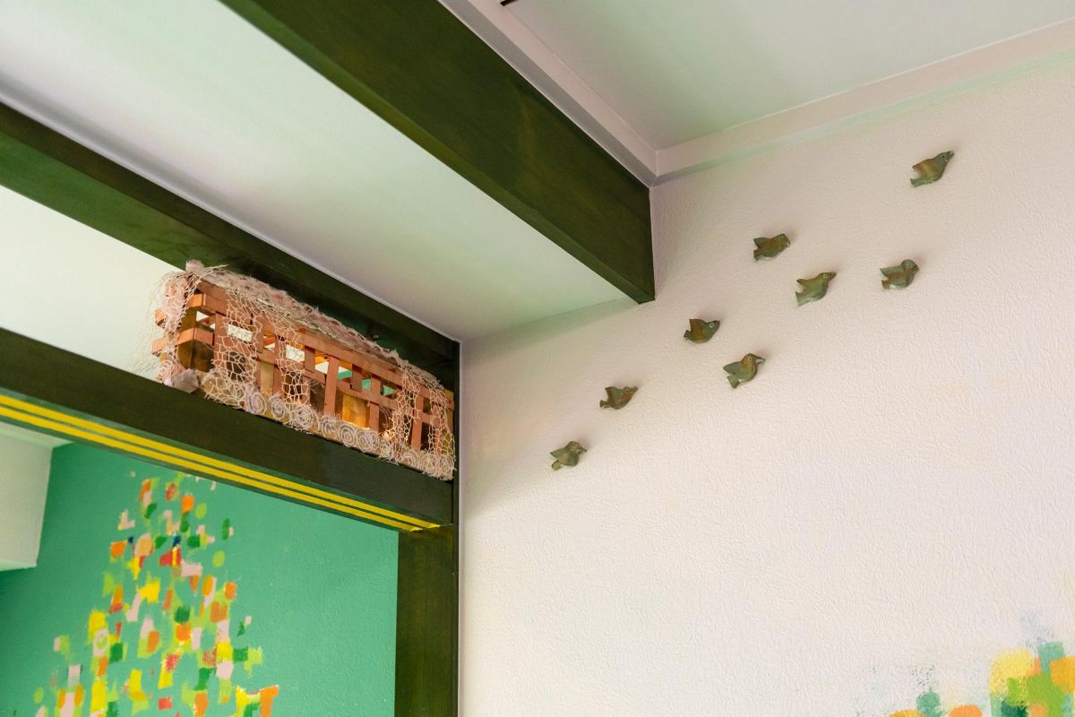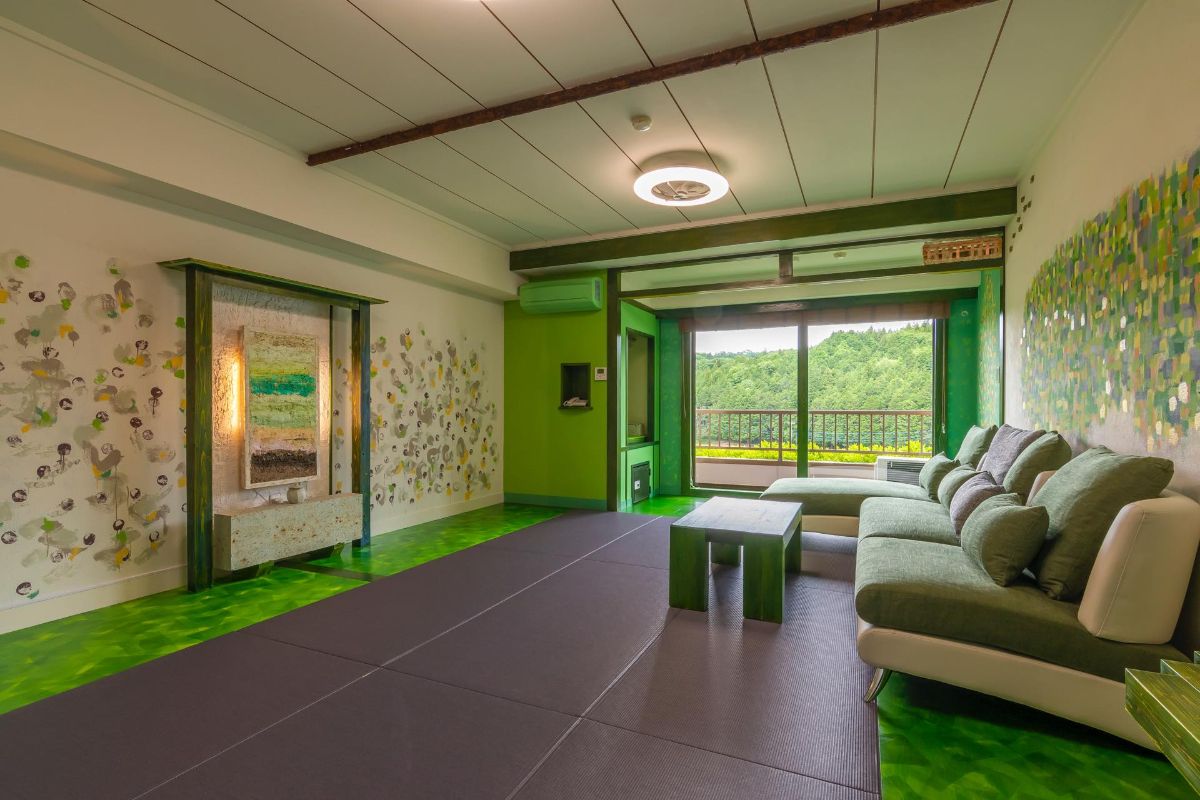 アーティスティックルームのひとつ、緑を基調にした客室「朝靄ASAMOYA」は、森の生き物が、土や水、空気から生を授かり、嬉々として空へ浮遊するさまがデザインのモチーフになっているそう。壁には小鳥たちが羽ばたく様子が陶器で表現されています。