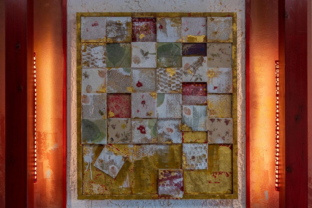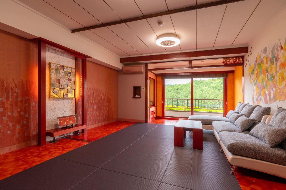 こちらは、赤を基調にした客室「朱華HANEZU」。朱華とは『万葉集』にも登場する色の名前で、黄色がかった薄い赤色を指します。部屋の中心に据えられた、植物をモチーフにしたアートは細部までじっくりと眺めたい美しさ。どちらの部屋も窓の外に広がる里山の風景とマッチした素敵な空間で、アートへの関心が増していきます。