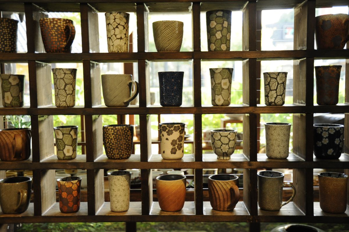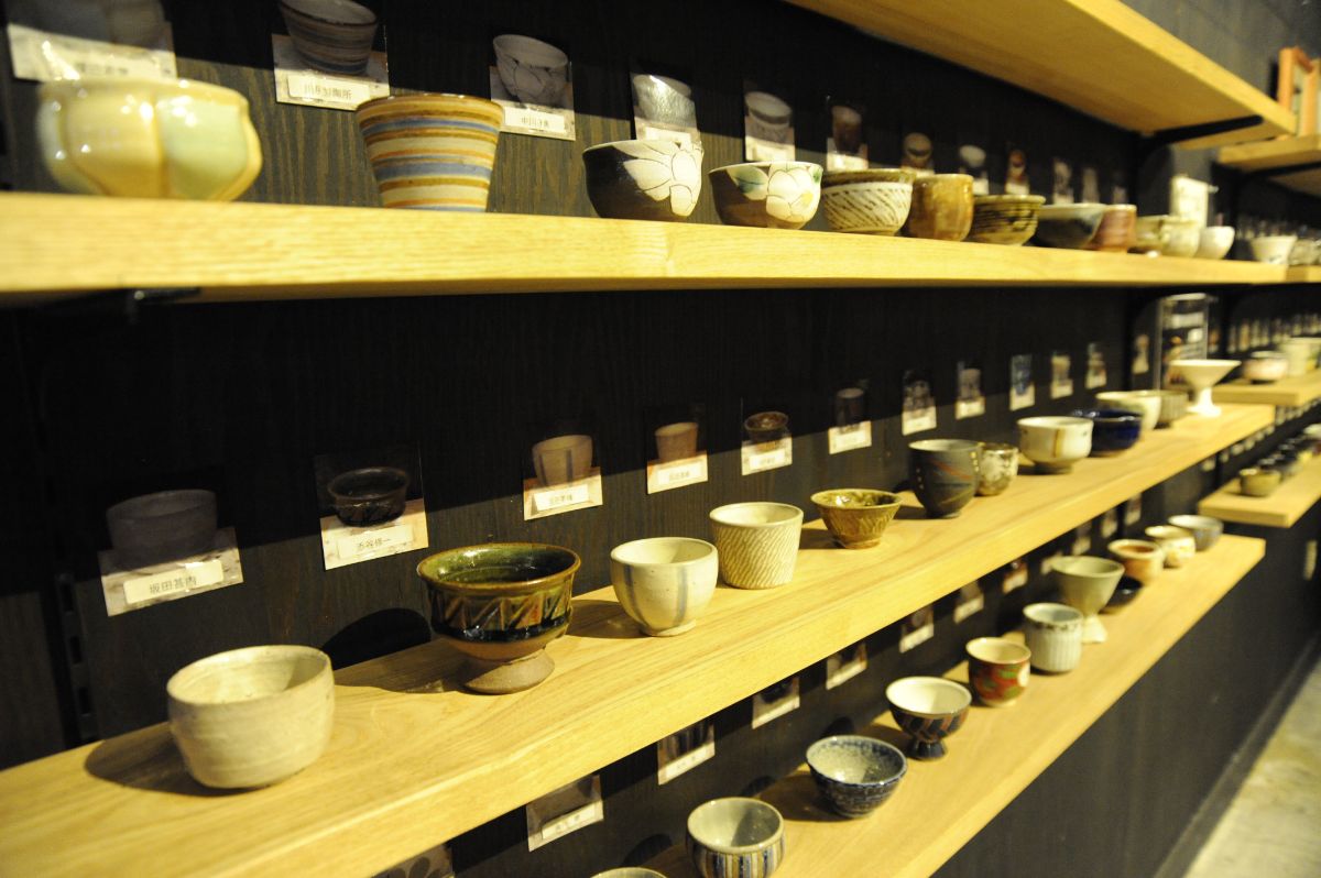 カフェ店内には作家が作る益子焼のぐいのみが並ぶ「ぐいのみギャラリー」も。好きなぐいのみを選んで、1ショット500円で利き酒を楽しめます。