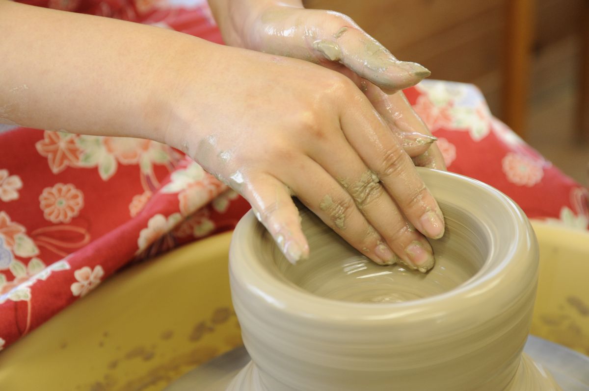 早速、挑戦。まずは高さを出し、上部の口を広げて形を作っていきます。しっとりとなめらかな土の塊が、手の中でどんどん形を変えていく感触がなんだか新鮮で、手の位置や力の入れ具合を変えて、つい遊んでしまいそう。