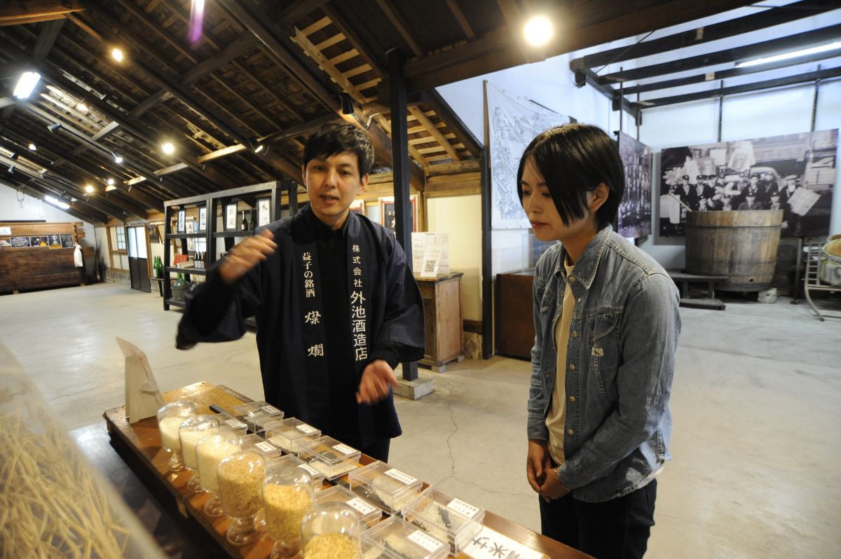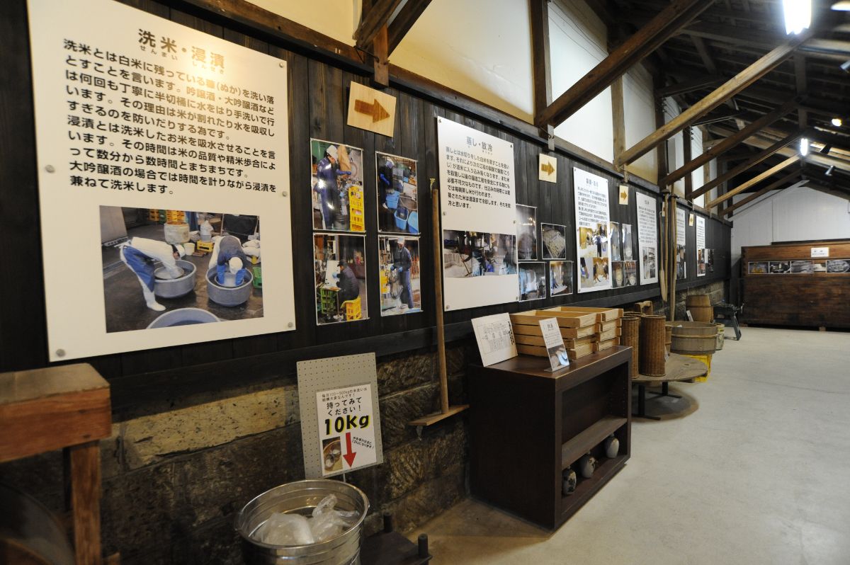 スタッフの宮田さんの案内で、敷地の奥にある古い蔵へ。衛生面の問題で実際の製造現場は見学できませんが、こちらに酒造りの道具や材料となる酒米、日本酒の製造工程などが展示されていて、日本酒について楽しく学べます。
