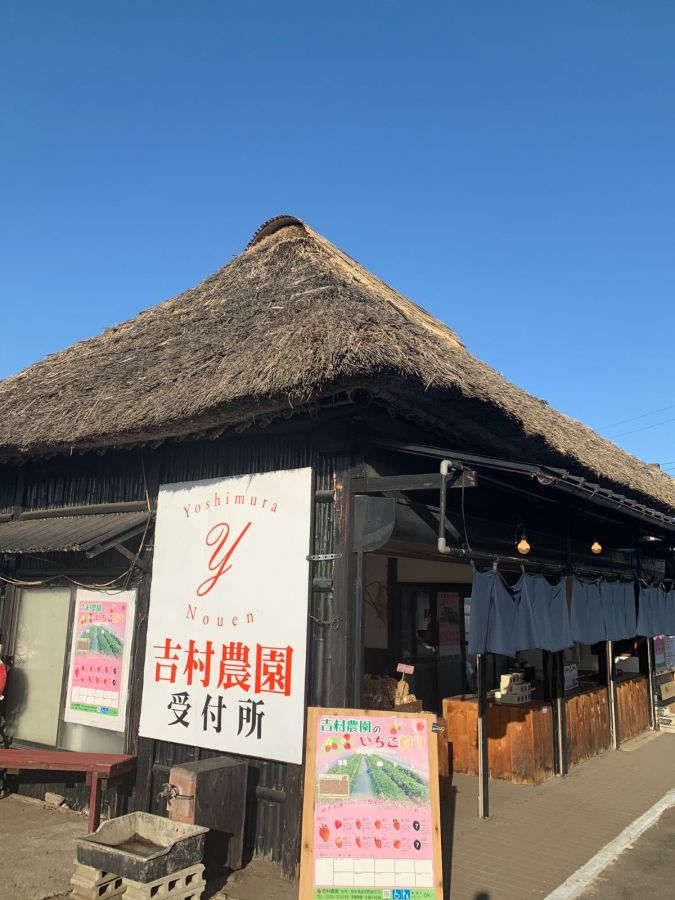 吉村農園の目印は、道路沿いに立つ茅葺屋根の建物。こちらで新型コロナウィルス感染症対策の手袋を受け取りハウスへ移動します。ハウス内ではマスクと手袋の着用が求められますが、ハウスの外にテーブルと椅子が供えられ、摘んだイチゴを食べることができます。好きなだけ摘んで、食べて、またハウスに戻って摘んでもOK。ビタミン豊富なイチゴでビタミンチャージしながら、イチゴ狩りを楽しみましょう。