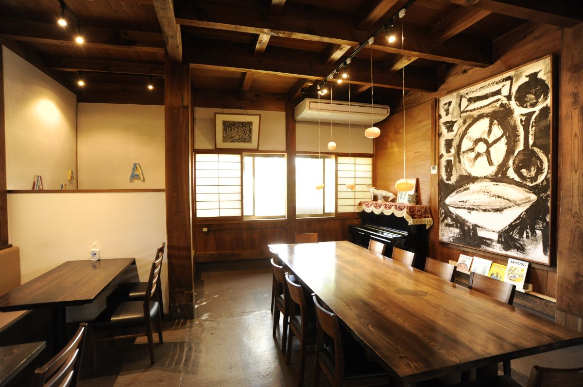 陶芸の町にある店とあって、陶芸作家やアーティストとの交流も多く、店内には個性的なランプシェードやオブジェ、絵画などのアートが飾られています。また、棚には作家物の益子焼のぐいのみがずらり。好きなぐいのみを選んで、益子の地酒を楽しめば素敵な時間が過ごせそうです。