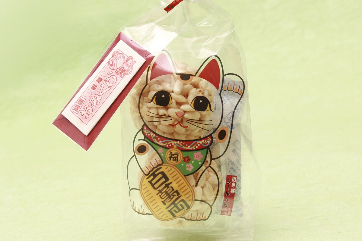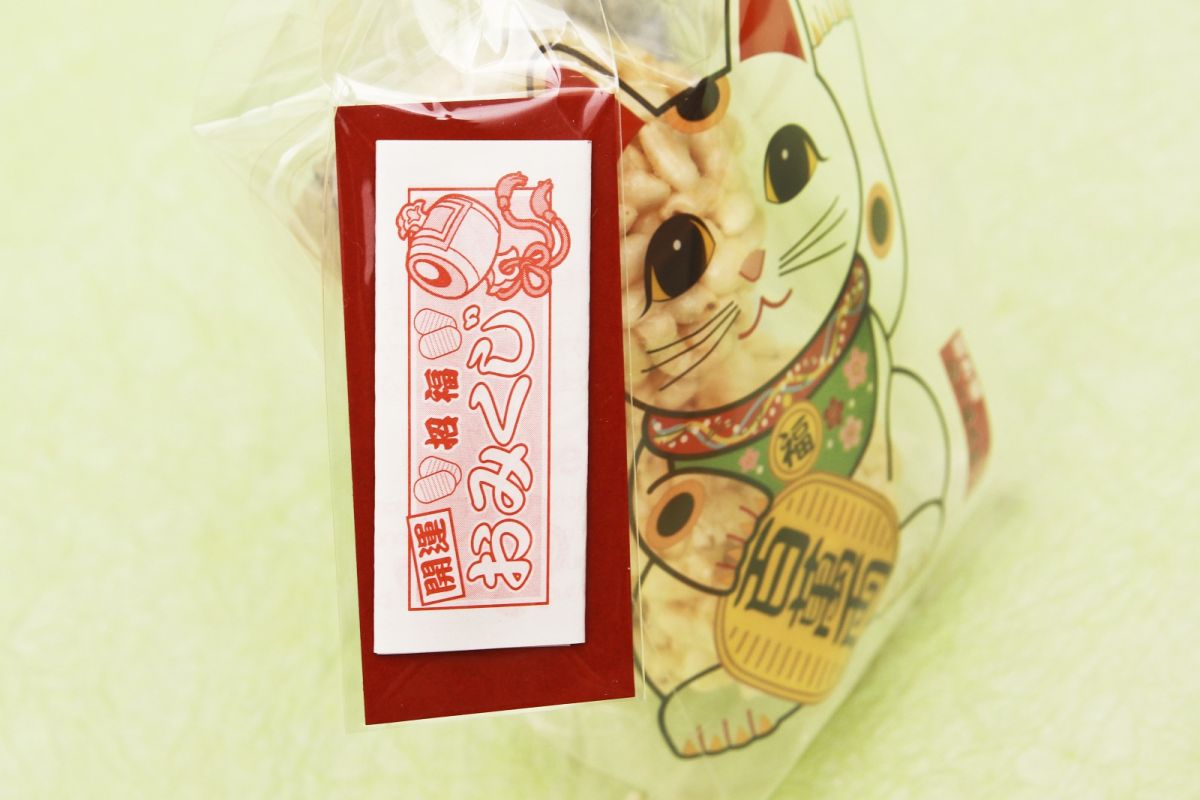 これを見つけた瞬間、猫好きの親友と自分のために即買い。中には球体にまとまったポン菓子が2個、二頭身の招き猫の中におさまりよく入っています。