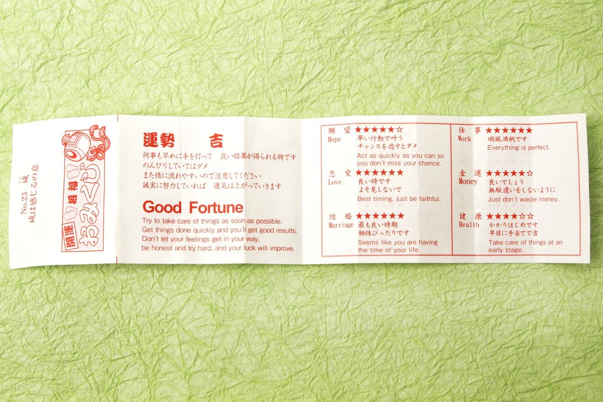 付いていたおみくじを開けてみると、日本語、英語、中国語、韓国語の四カ国語で書かれていて、願望、恋愛、結婚、仕事、金運、健康についてメッセージが書かれています。外国人の友達に贈っても喜ばれそうです。