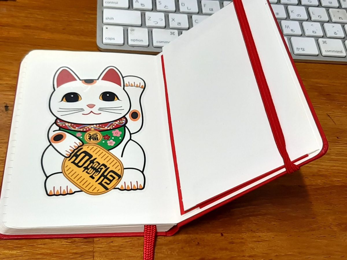 パッケージを飾っていた招き猫は、実はシールになっていました。私は密かに新しく買った2023年用の手帳の内側にペタリ。手帳を開くたびに、優しい目をした招き猫とご対面できます。みなさんも、お守りがわりにどこかに貼ってみては。