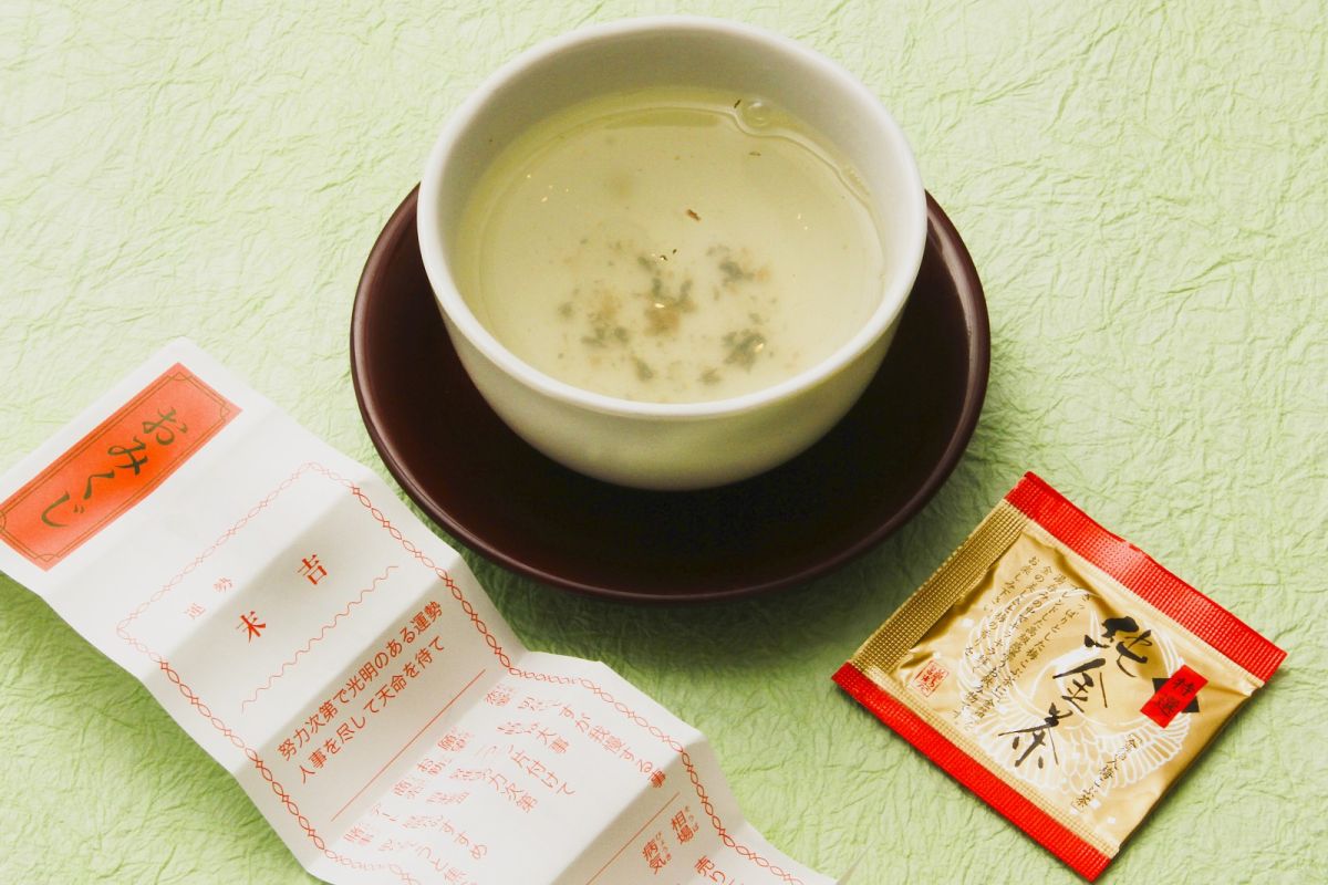 飲み方は、湯飲みに梅昆布茶を入れて熱湯を注ぐだけ。金箔入りということで、湯飲みの中にキラキラと小さな輝きが見えます。おみくじの内容をあれこれ検証しながら、新年の抱負などを語り合ってみては。
