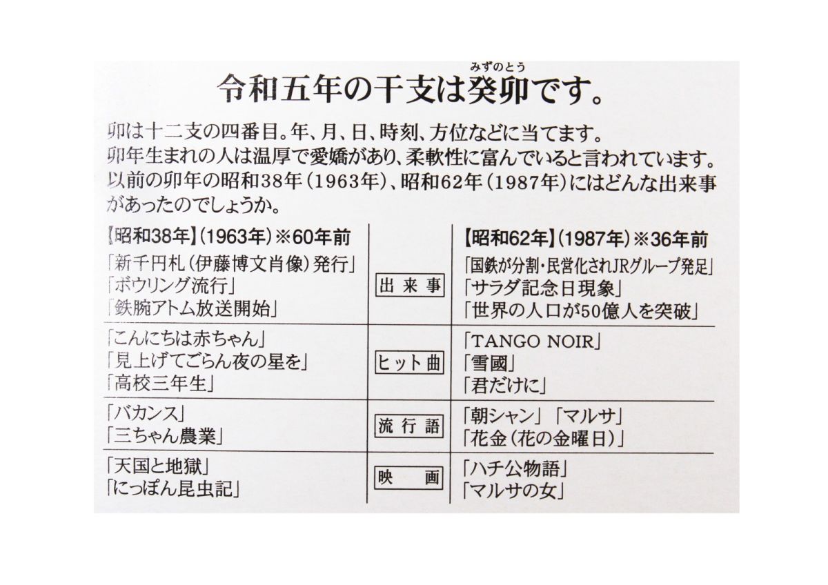 箱の裏には卯年生まれの人の性格や、過去の卯年に起きた出来事やヒット曲、流行語などが解説されています。36年前の卯年の流行語は「朝シャン」だったとか(朝に髪を洗うこと)。お年賀を配る際や、新年会での小ネタとして使えるかもしれませんね。