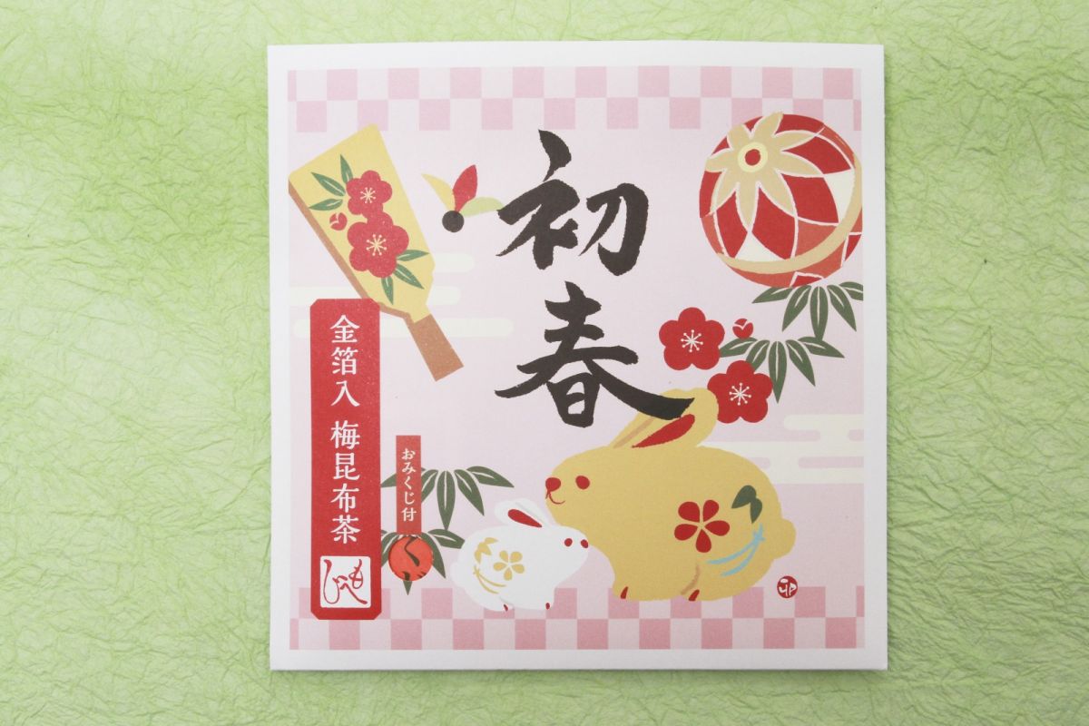 おめでたい初春のパッケージに入った「金箔入梅昆布茶 卯」178円。