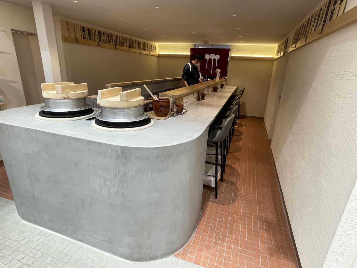 店内の飲食スペースには、カウンター席が13席ほど。大きな羽釜がインパクト大で、モダンな空間に和のエッセンスをプラスしています。
