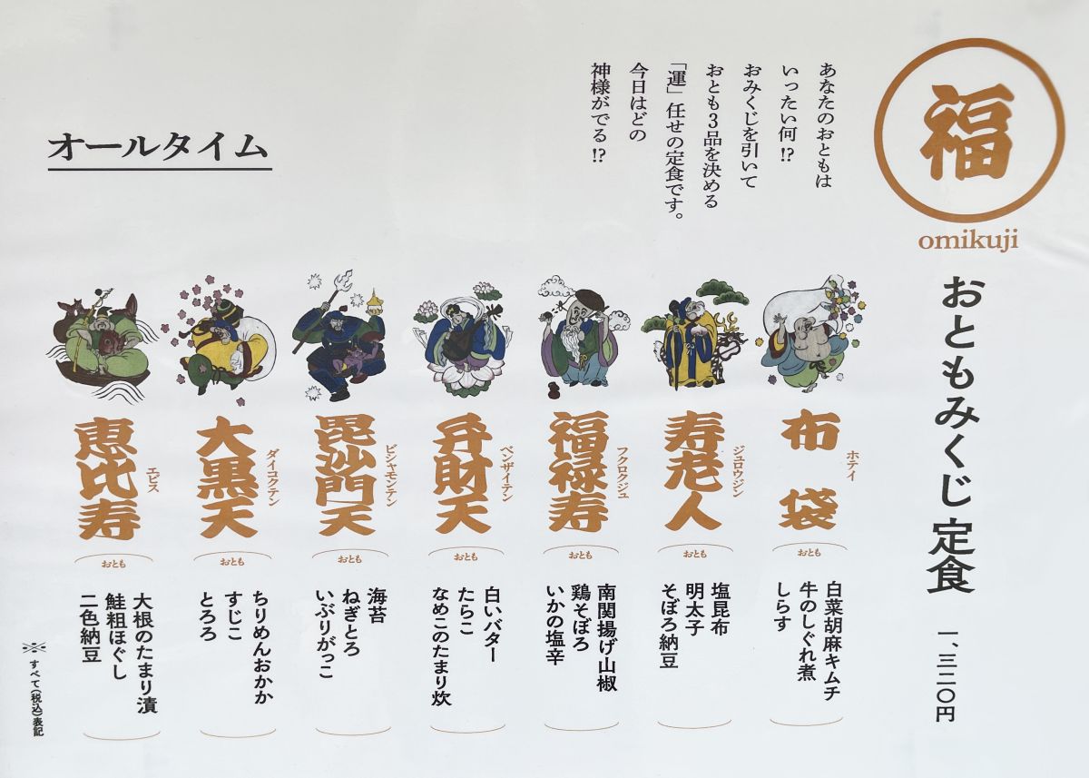 今回は、一番人気の「おともみくじ定食」をチョイス。なんと七福神のおみくじを引いて、ごはんのおとも3種類を決めるというシステムなんです。どの神様が出るかワクワク…!