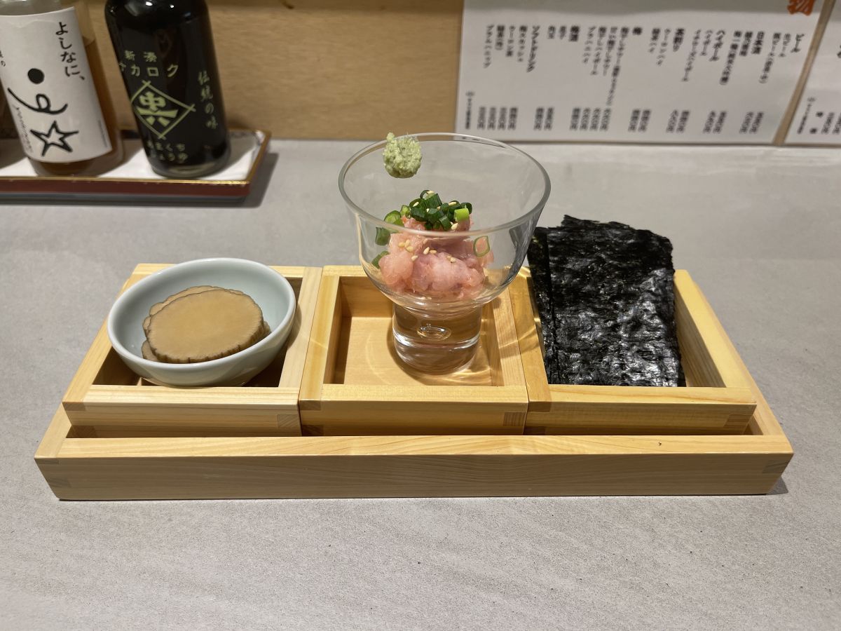 「毘沙門天」のおともの「海苔・ネギトロ・いぶりがっこ」は、おしゃれな枡に入って登場。おともは七福神のように全員が大当たりということで、どれが当たってもワクワクするような組み合わせにしているそう。ちなみに、苦手なものが当たってしまった場合は引き直しできるので安心です。
