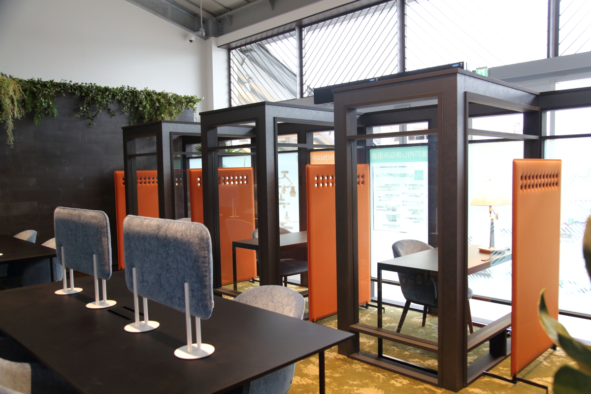 フロントのそばにはワーケーションラウンジが。ホテル滞在中は7時から24時(22時最終受付)の間、自由に利用可能で、セルフサービスでコーヒーもいただけます。ミーティングルームや半個室タイプもあるので、新しい働き方に対応した旅が実現できます。