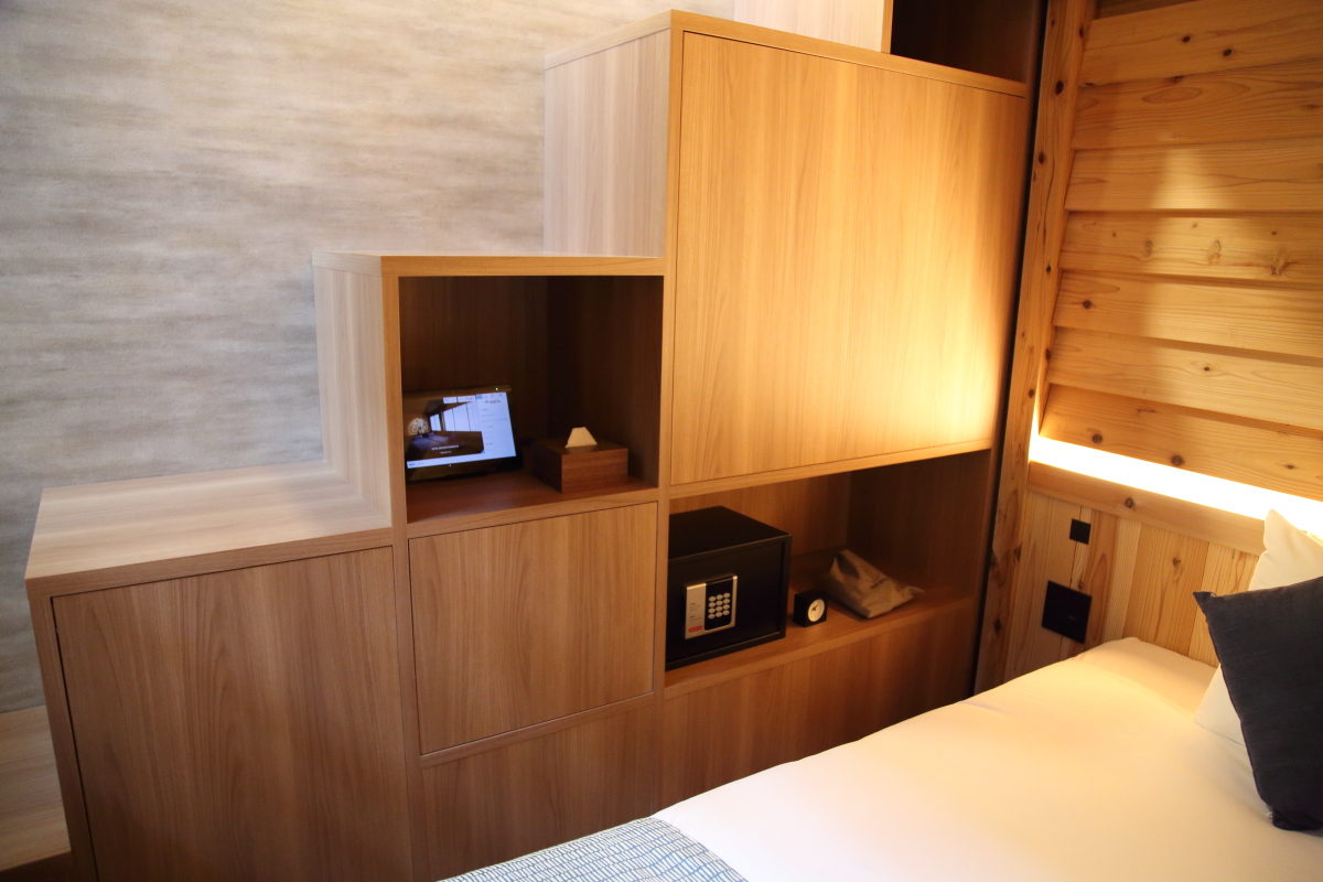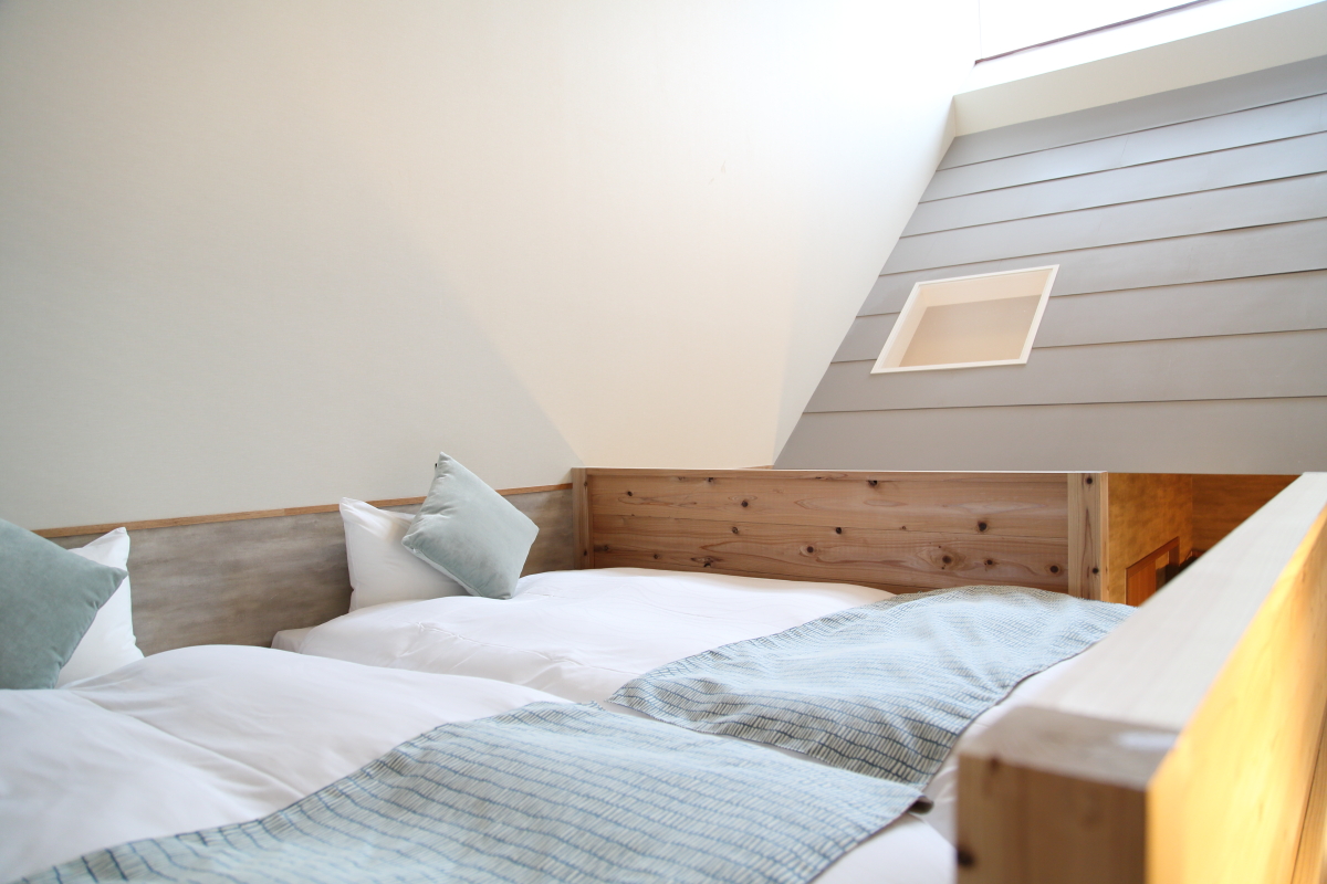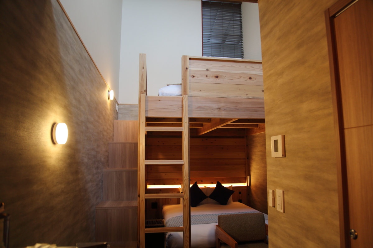 1階のベッドサイドにある棚は2階へのアプローチも兼ねています。ワクワクする構造に機能性も備えた客室なので、2世帯の家族旅行や友人グループでの宿泊も楽しそう♪