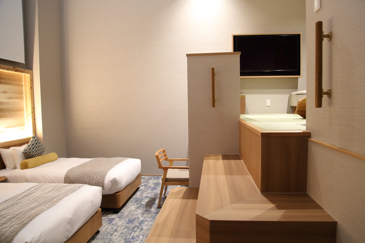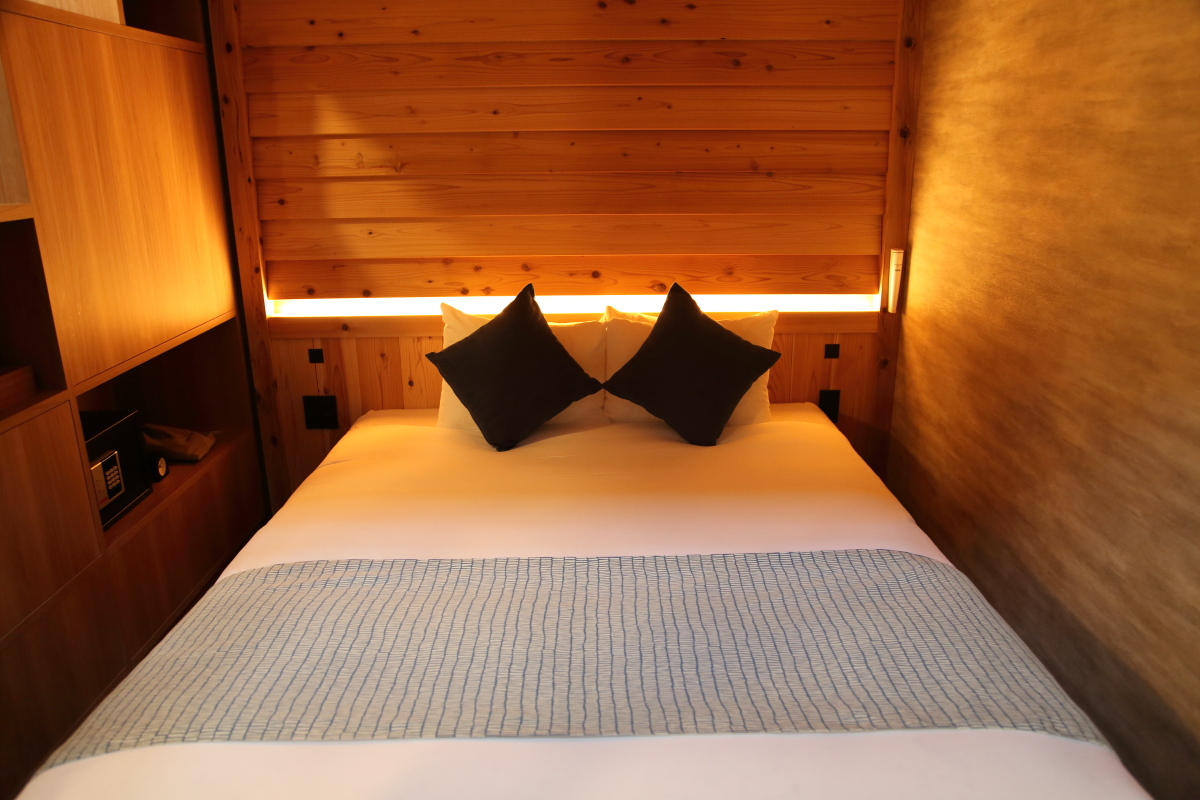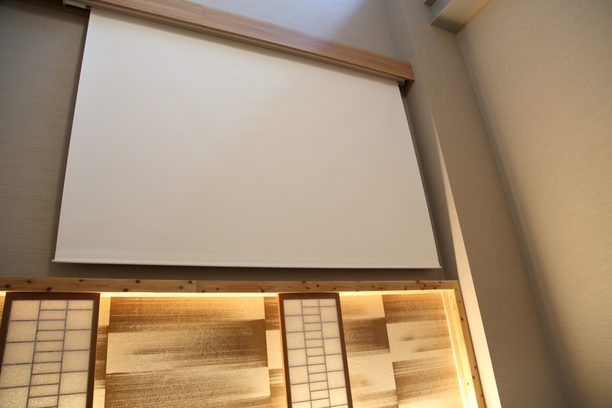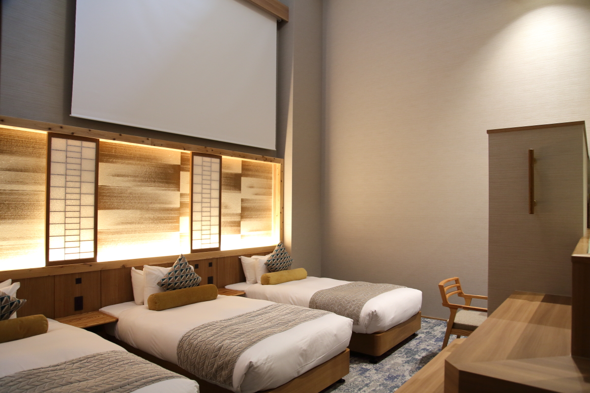最後にご紹介するのは、37平米の空間に120インチの巨大なプロジェクトが映える「ビーコンスイート」。シモンズのベッドが3台並んでもなお余裕のある広さで、障子の設(しつら)えが高級感と上質さを表しています。