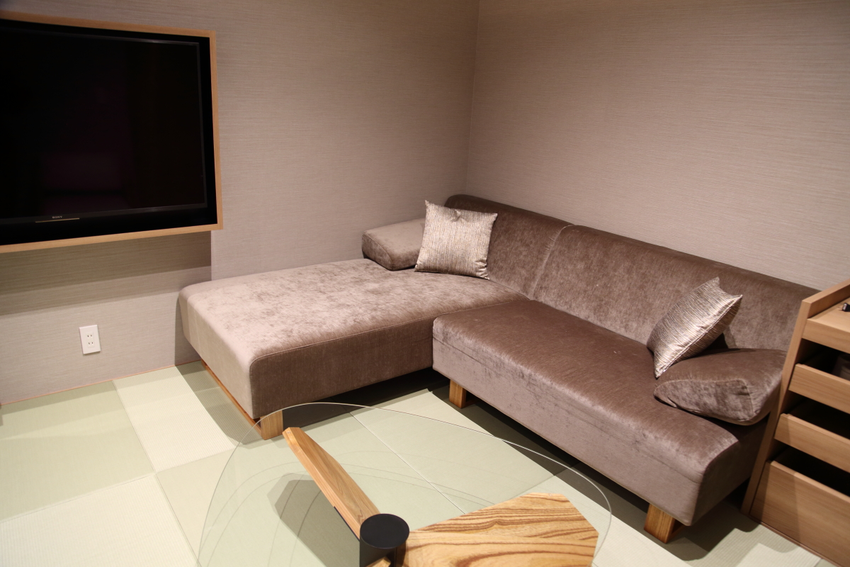 寝転がれるほど大きなソファにTVも完備され、独立したくつろぎの空間が広がっています。