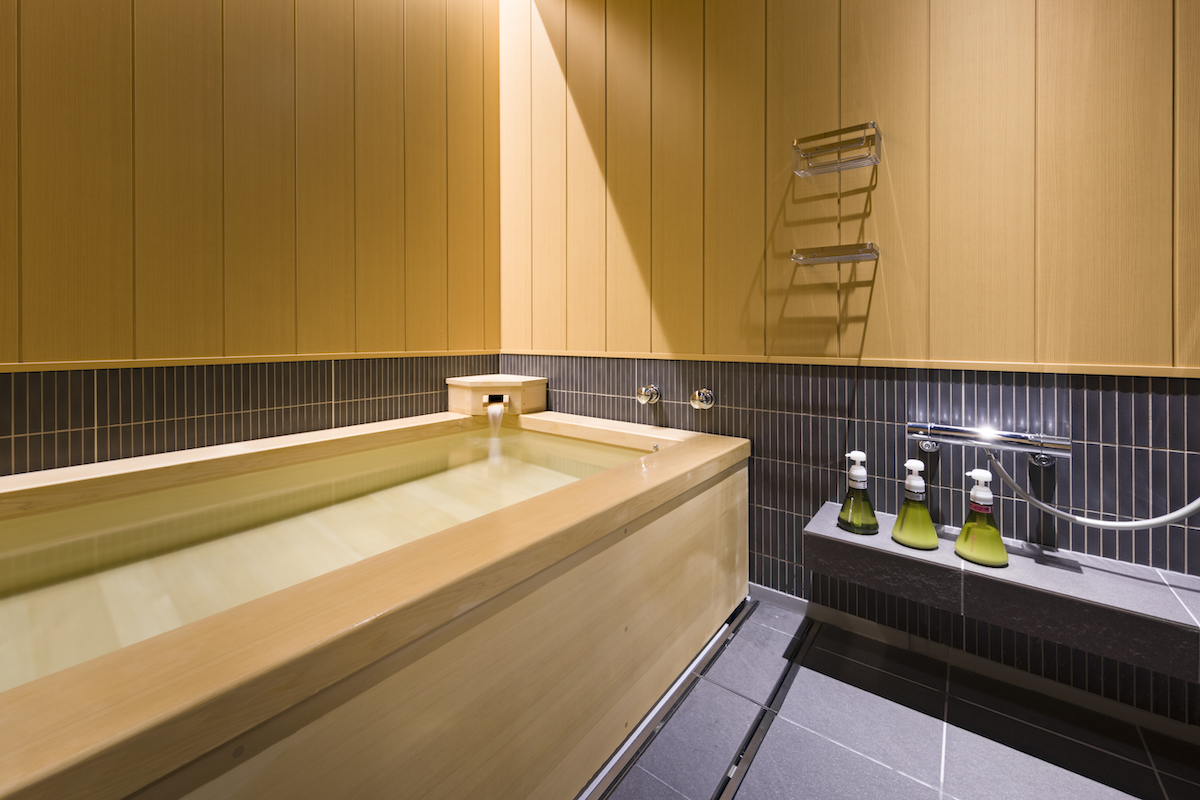 もうひとつのお風呂は、檜の木材がふんだんに使われた「プライベートバス・檜(ひのき)」。豊かな檜の香りに包まれながら、足を伸ばしてのんびりリラックス。大浴場とはまた違う趣で、旅先であることを忘れさせてくれるようなリラクゼーションスペースです。