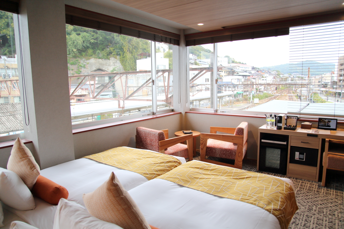 自分のロードバイクを部屋に持ち込んで宿泊できるタイプの角部屋「コーナーサイクルツイン」。大きな2面の窓から入る自然光で部屋が明るく、また真下がJR尾道駅のホームになっているので、迫力のトレインビューが楽しめます。タイミングがよければ、珍しい観光列車にも出合えるかも…?
