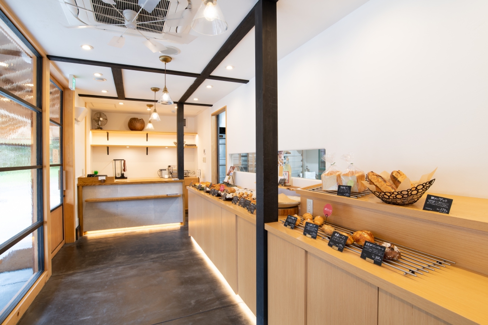 スタイリッシュな空間にバゲットや食パンなど定番のパンのほか、和菓子の素材としても重宝される丹波黒豆や北川村の柚子、旬の素材を使ったパンなどが並びます。2階のカフェでイートインできますが、テイクアウトして屋外で食べればピクニック気分も味わえます。