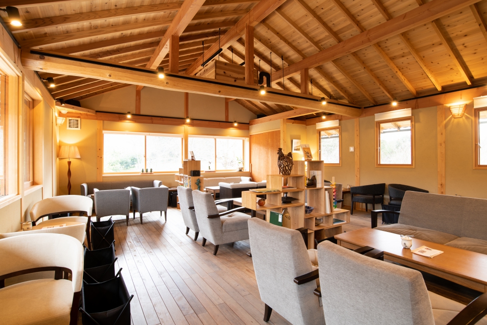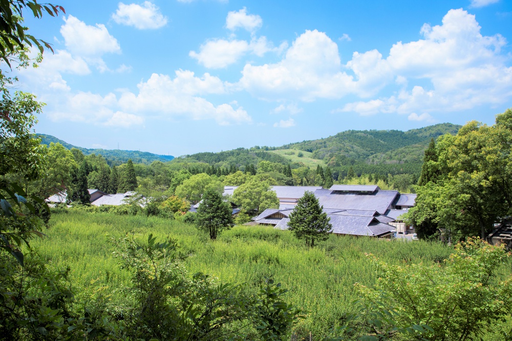 広大な敷地にはほかに、寿長生の郷で採取した土と信楽の土を混ぜて器を焼く陶房「十〇地(とわぢ)」や、四季の山野草を眺めながら散策できる「野の花観音径」、体験イベントの会場である里山館、梅林を一望できる高台の「山のテラス」も。また、総合案内所(古民家)から片道約30分の距離で、持国天をお祀りする山頂に行くこともできます。