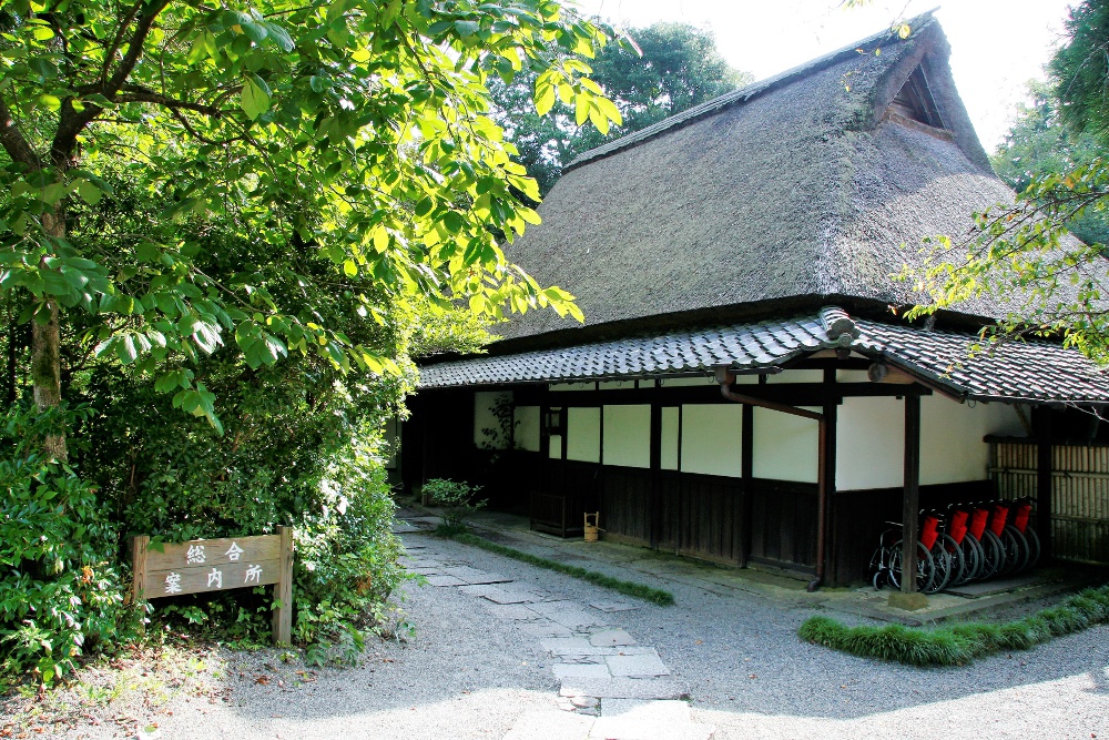 総合案内所となっている茅葺きの古民家は、もともとこの山に立っていたもので、江戸時代後期の建築。このあたりの「大石」という地名にも由来する大石内蔵助に縁があるそうです。